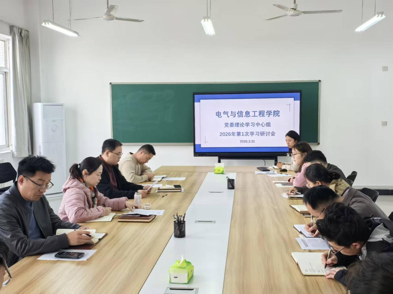2026年3月31日,电气与信息工程学院党委理论学习中心组开展2026年第1次学习研讨会,围绕会前自学、集体学习、交流研讨三个环节展开。学院中心组成员参会,会议由党委书记陈长征主持。