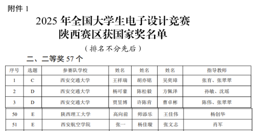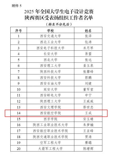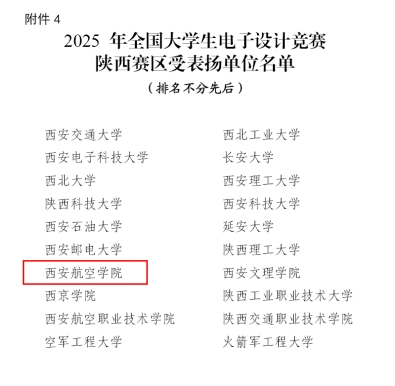 近日,陕西省教育厅公布了2025年全国大学生电子设计竞赛陕西赛区获奖名单,我校参赛队伍喜获本科组陕西省一等奖1项、二等奖2项、三等奖6项,并在综合测评中获得国家二等奖1项。西安航空学院为本次竞赛的 “受表扬单位”,王成老师为“优秀组织工作者”。