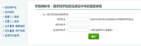 上传完毕后等待客服审核,审核通过后方可进行实名信息绑定。学生可点击左侧的菜单“证件重复-客服审核”关注客服的审核进度,还可通过左侧菜单的“证件重复-用户协助”来解决证件号码重复的问题。进入页面后,点击发送协助请求按钮,输入同学姓名等信息,请该同学登录自己账户,点击页面右上角的收件箱图标,协助解决证件号码重复。